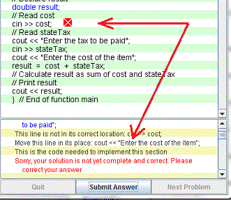 - The first incorrect statement in the program is marked as incorrect in the answer window
